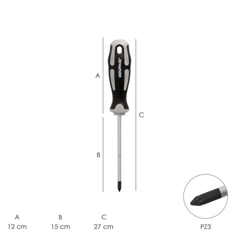 Destornillador Pozidriv Acero S2 Mango TPR Bimaterial. Medida PZ 3 x Ø 8 x 150 mm. DIN5262. WOLFPACK LINEA PROFESIONAL