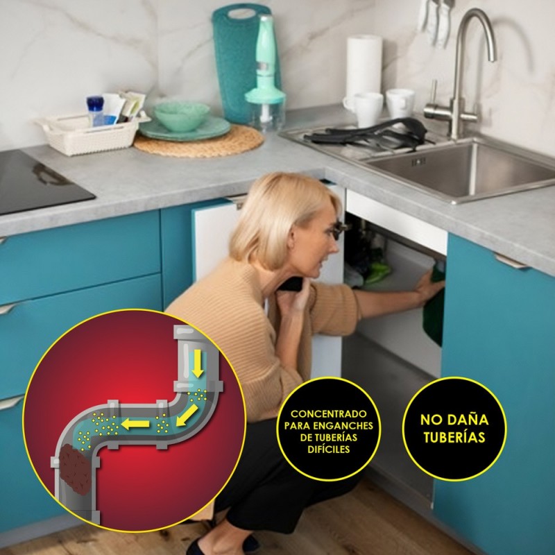 - Descompone y elimina instantáneamente todas las sustancias (pelos, grasa, jabón, etc.) que obstruyen las tuberías sin dañarlas.