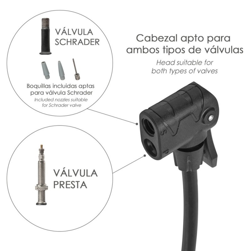 - El cabezal de la bomba está diseñado para poder usar las valvulas Presta y Schrader sin necesidad de adaptadores adicionales, están ambas valvulas en el mismo cabezal.