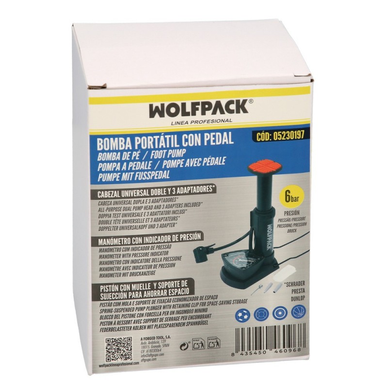 Bomba Aire Pie / Pedal Con Manometro 6 Bares Cuerpo Acero, Valvulas SCHRADER y PRESTA con Adaptadores. Bomba Bicicletas, Motos WOLFPACK LINEA PROFESIONAL