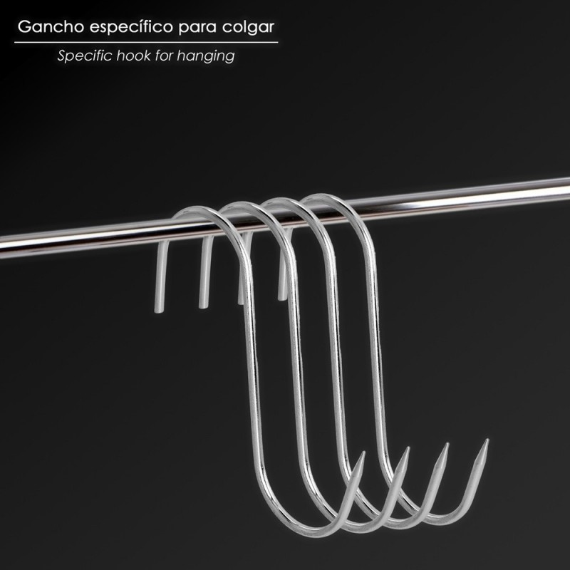 - Forma "S" con punta puntiaguda para facilitar el clavado en productos carnicos.