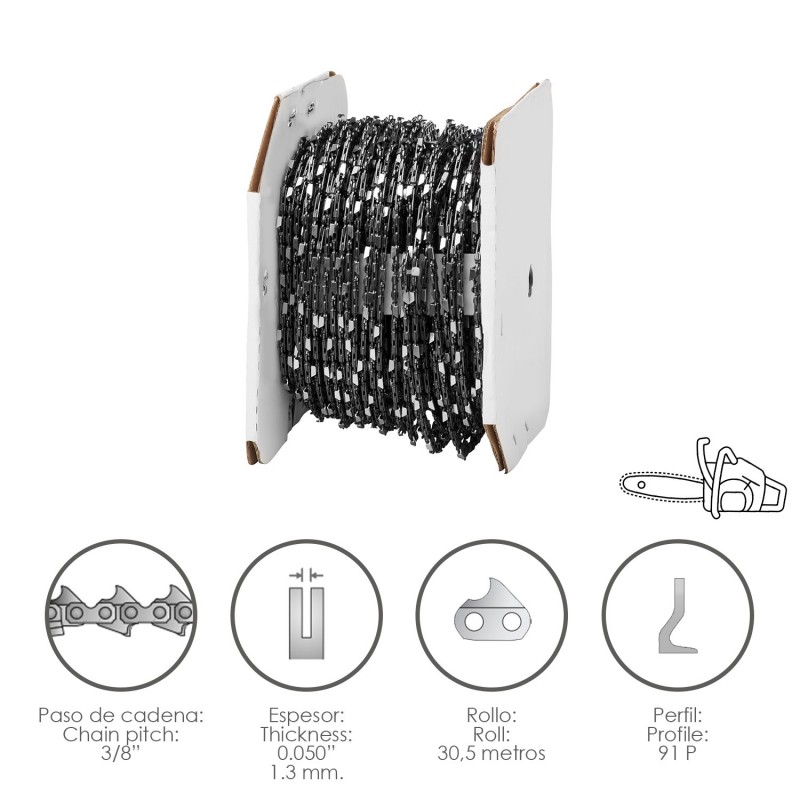 Cadena Motosierra 3/8" / 0.050" 1,3 mm. / 91 P / Rollo 30,5 metros. PAPILLON