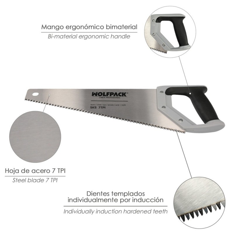 Serrucho Carpintero Bimaterial 400 mm. / 16" Acero SK5 Triple Afilado Sierra Carpintero, Serrucho Carpinteria, Sierra Costilla WOLFPACK LINEA PROFESIONAL